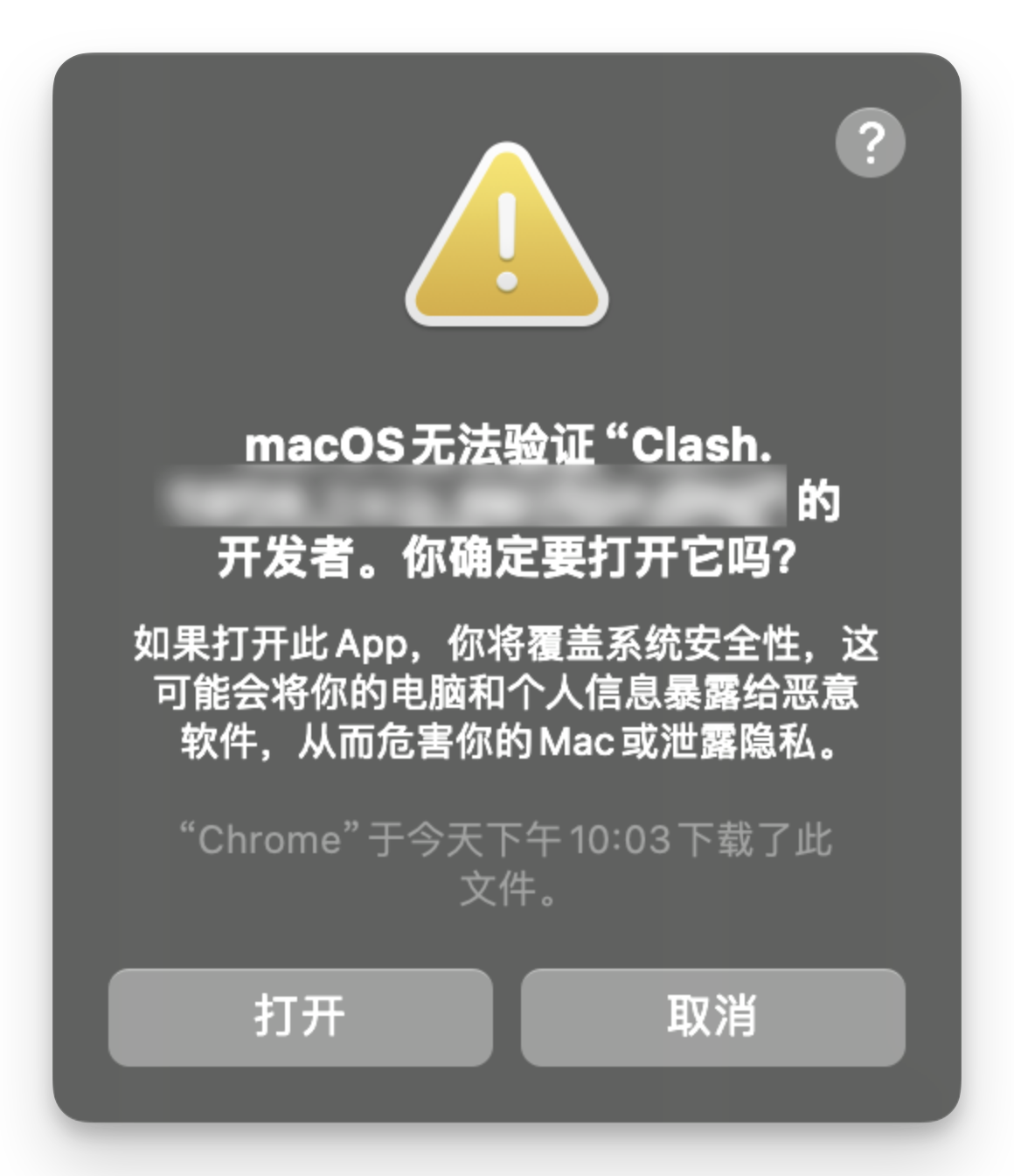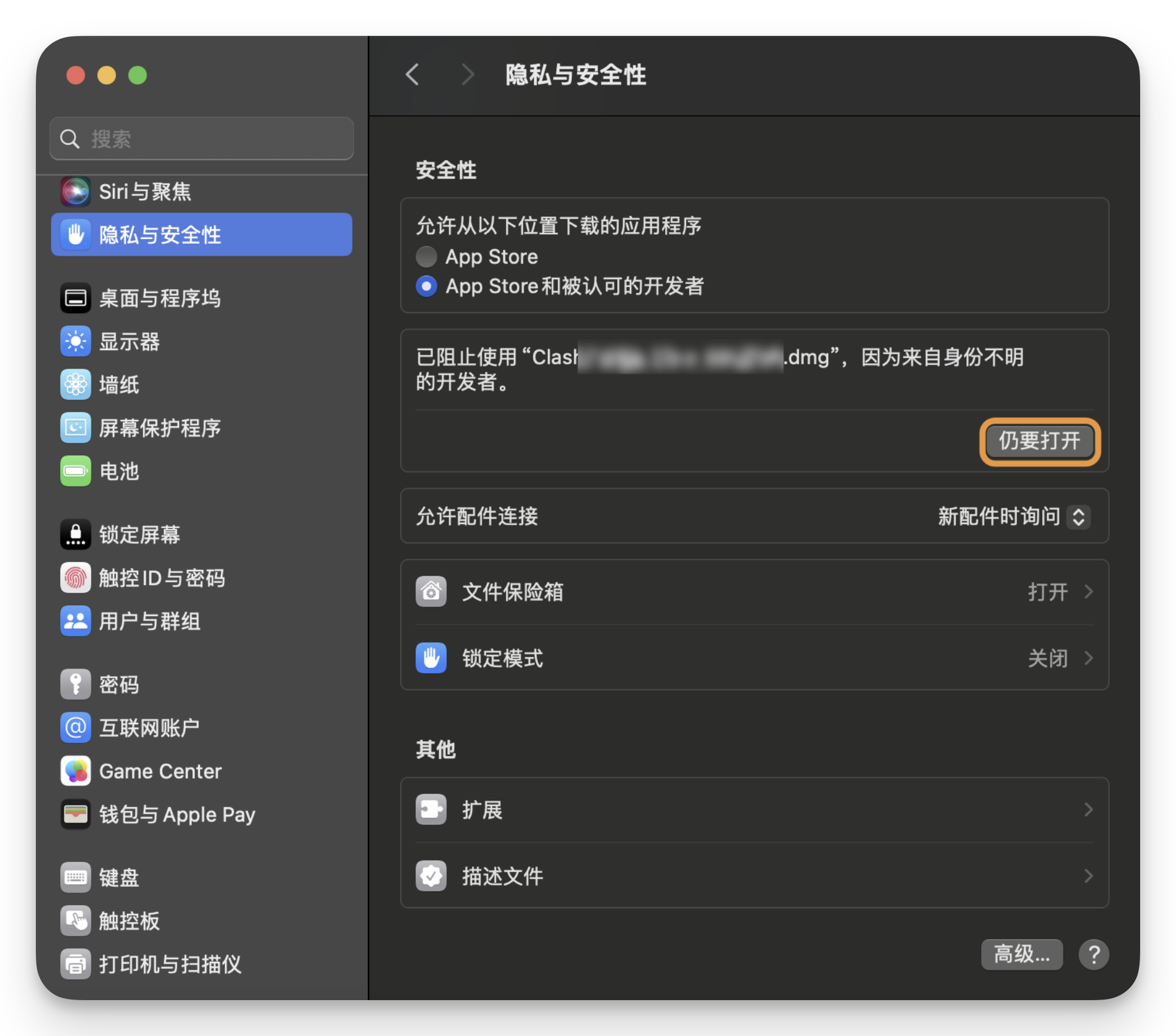 3.”无法打开flclash“的弹窗点击”取消“,看下图操作,点击”仍要打开“,然后输入电脑的登陆密码,点击“修改设置”,点击“打开”