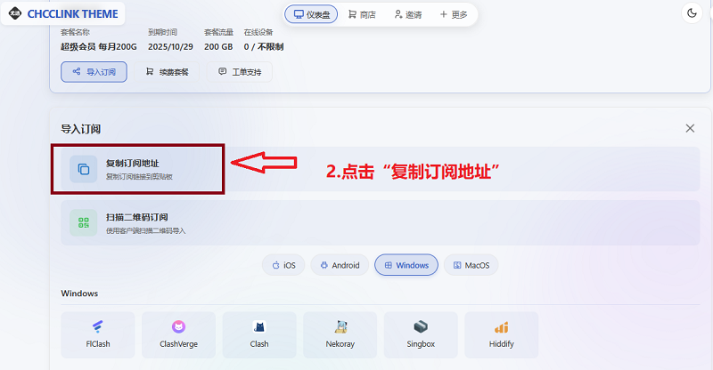 ①、官网首页→”一键订阅“→”复制订阅地址“