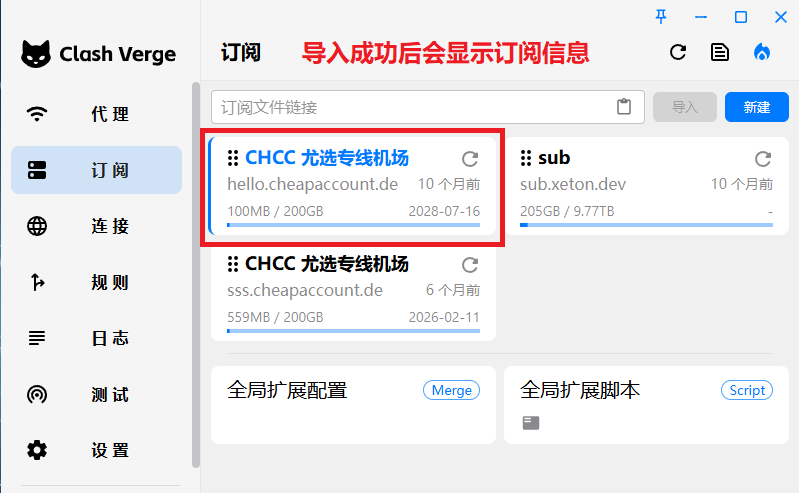 会自动跳转“Clash Verge”软件内,导入成功后会显示订阅信息
