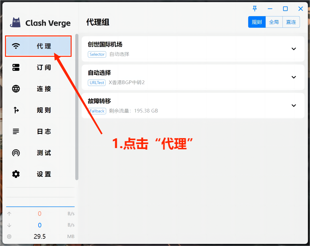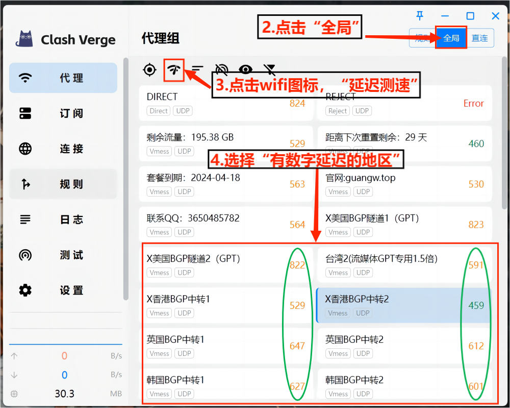 ①.点击左侧“代理”,选择“全局”,点击右上角“延迟测试”(WIFI图标),然后选择“有数字延迟的地区”