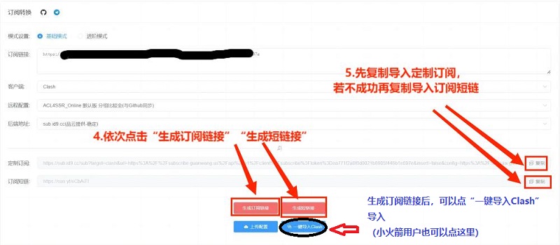 订阅链接是官网里的订阅地址(官网首页-一键订阅-复制订阅地址),然后点击生成订阅链接,生成后,点击一键导入clash(苹果用户也是点这个),就可以成功配置